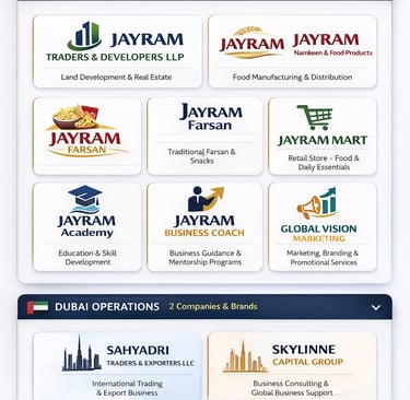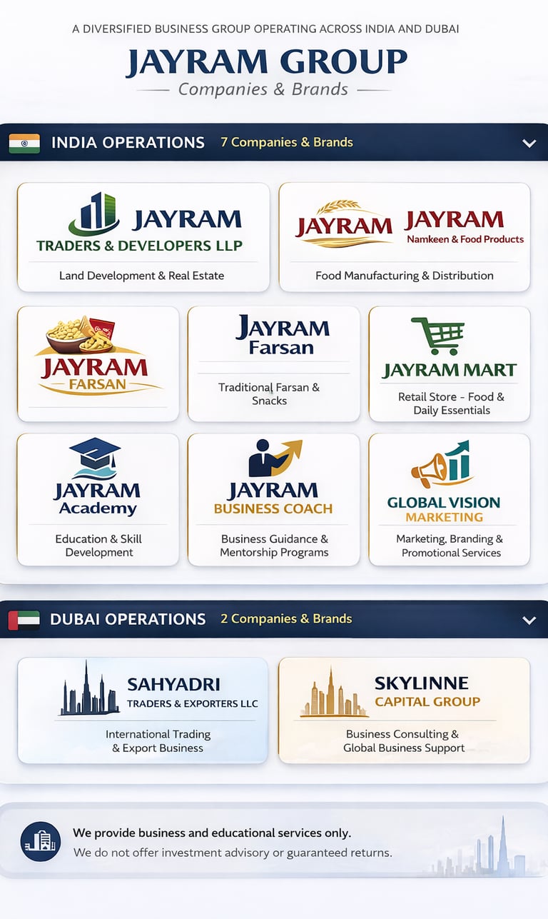 Jayram Group is a diversified business group with presence across India and Dubai, operating in multiple sectors including real estate, food, education, trading, and business services.